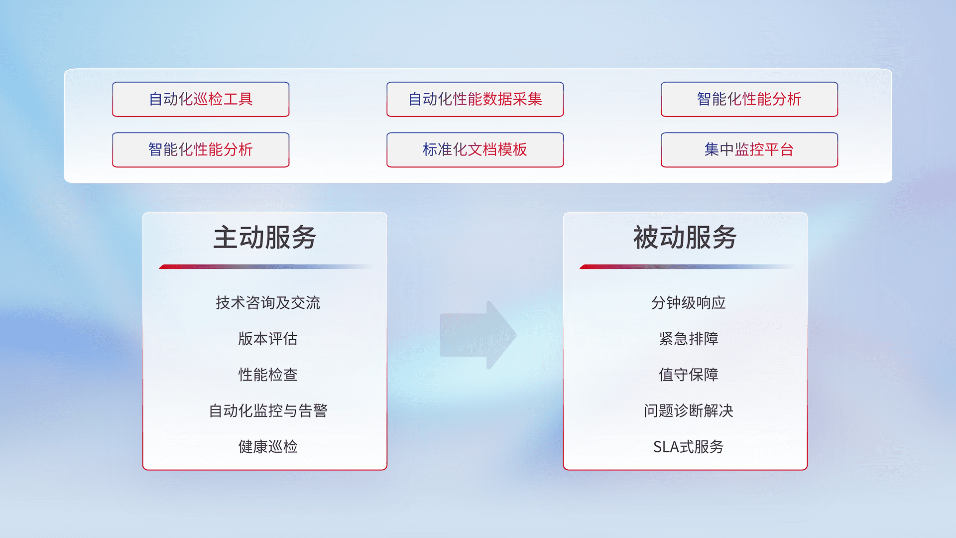 智能化工具和标准化文档,,,保障服务质量,,,提供主动服务(包含技术咨询、、版本评估、、、性能检查、、自动化监控与告警、、、、健康巡检)和被动服务包含(分钟级响应、、紧急排障、、、值守保障、、、、问题诊断解决、、、SLA服务)。。。。